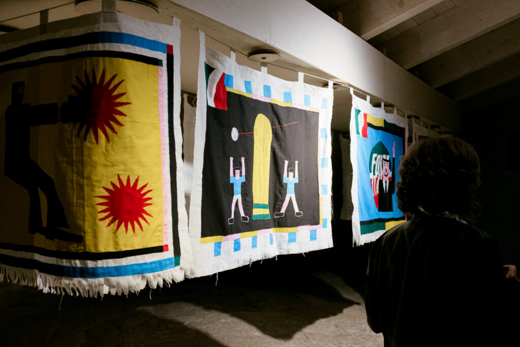The research is aimed at finding symbols and figures that convey information and generate shared meanings within the reference community: an example is given by the ASAFO flags, historically used in some areas of Ghana, from which Geometric Bang’s stylistic research draws inspiration. During the exhibition, the facts and events that have contributed to the creation of a national common thought are repeatedly revisited, through a series of selected historical, social and cultural moments to portray how our country has experienced the last eight decades of its history. Events become confused, temporal planes crumble and complexities thin out: historical reading unfolds through a personal journey, resulting from the artist’s direct experience.